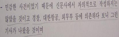- “무슨 호텔에 들었다. 또 몇 시에 탑승했다. 그 소스(source)는 대부분 아마도 제 기억에는 정부당국에서 릴리스(release)한 것 같습니다.” (당시 한국일보 최해운 기자-MBC'PD수첩)