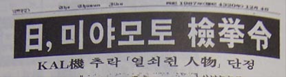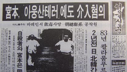8-1. 사건 발생 3일 만에 시작된 무지개 공작 문건이 언제 작성되었는지는 알 수 없으나, 공작의 시작과 동시에 KAL858기 사건을 북한과 연결짓는 결정적인 근거로서 전 언론의 헤드라인을 장식한 기사가 바로 재일 북한공작원이라는 미야모토 아키라(한국명 이경우)와 관련된 내용임.