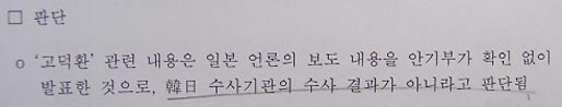 ▷ 위 발표내용의 근거는 안기부 내부의 회신문(해외담당○국장→수사국장)으로, 회신문의 내용은 일본 언론의 보도내용을 인용한 것이었으나, 일본경찰의 수사결과보고서에 ‘고덕환’ 관련내용은 없음. (국정원자료609쪽-국정원종합보고서345쪽)