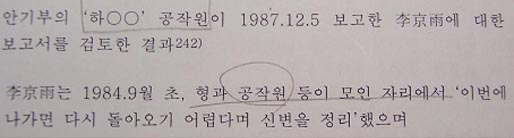 ▷ 국정원은 위 안기부 보고서 내용의 배경과 그 실체, 더하여 이경우와의 관계에 대해 밝혀야 할 것임.