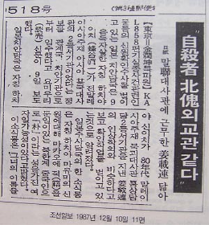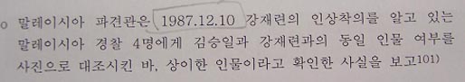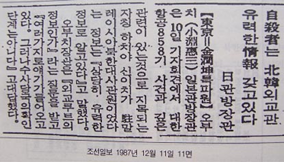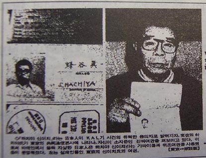 3-9. 앞서 오부치 일본 관방장관은 일본경찰당국의 발표를 근거로 당시 신원이 드러나지 않은 하치야 신이치(김승일)가 ‘말레이시아 주재 북한대사관 서기관 강재연이 확실하다’고 언급함. (조선일보1987.12.11자 11면, 니혼TV1987.12.12자)