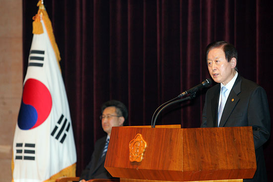 ▲ 11일 오후, 김하중 통일부장관이 이임사를 하고 있다.[사진-통일뉴스 조성봉 기자]