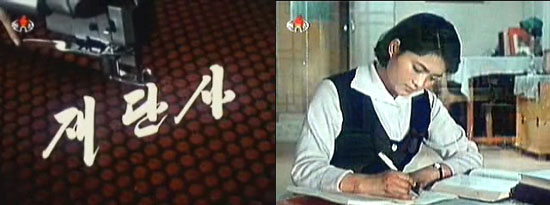 ▲ 예술영화 <재단자>(1972) : 옷의 품질과 다양성 보다 실적에만 신경 쓰는 피복공장 생산부장과 인민들의 다양한 요구에 맞게 옷을 설계하려는 재단사인 영희가 대립하는 내용으로 영희가 좋은 설계를 위하여 학습하는 장면. [자료사진-유영호]