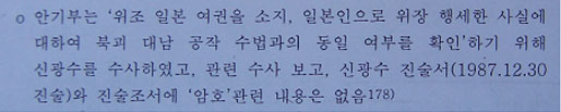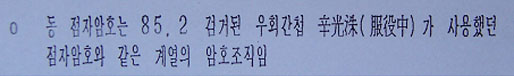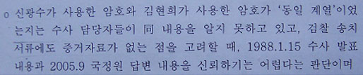 ▷ 신광수 사건을 알고 있는 김현희 수사책임자 한○○는 신광수가 사용했던 것과 같은 종류가 아니냐는 국정원과거사위의 질문에 “자신은 처음 본 것이라며, 신광수는 비슷한 암호를 사용치 않았다”고 답변함. (국정원종합보고서309쪽)