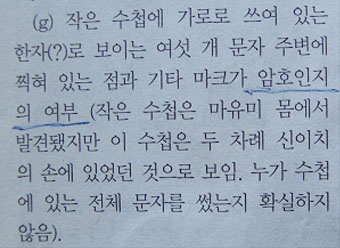 ▷ 이 증거물에 대해 감정을 거치지 않은 것은 매우 중요한 문제인데, 이는 현재까지 의문으로 남아 있음.