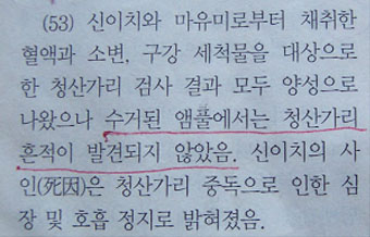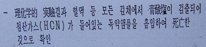 3-1. 안기부는 수사발표 당시 두 김이 음독자살을 기도할 때 사용한 독극물의 종류에 대해 “앰플에 독약을 액화 충전한 형태의 청산가스(HCN)”라고 발표함. (수사결과자료21~22쪽)