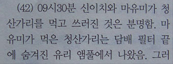 ▷ “하치야 마유미가 먹은 청산가리는 담배 필터 끝에 숨겨진 유리 앰풀에서 나왔다”고 함. (바레인보고서42항)