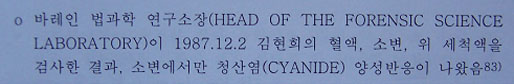 ▷ 국과수는 1987.12.19 김승일의 사체를 부검한 결과, “독물을 삼켰다기보다는 흡입하였다고 보는 것이 타당하다”며 독극물의 종류가 청산가스(HCN)라고 밝힘.
