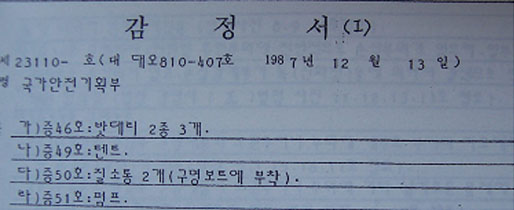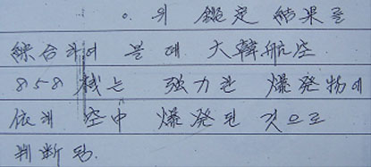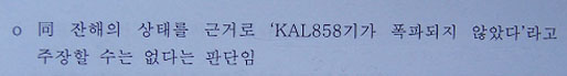 ▷ 그럼에도 국정원은 “감정결과를 종합해 볼 때 KAL858기는 강력한 폭발물에 의해 공중폭발된 것으로 판단됨”이라 결론내림. (수사기록1402쪽)