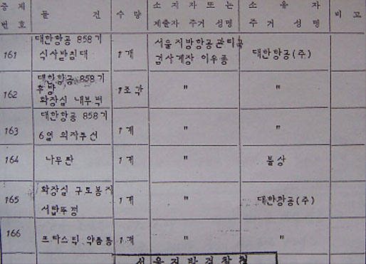 ▷ 이 증거물은 단순 장비품인 구명보트와 달리 ‘항공기 화장실 내벽’, ‘항공기 좌석에 연결된 식사받침대’, ‘의자쿠션’ 등의 항공기 동체일부와 내부설비 잔해인데다. 수량도 6개에 이름.