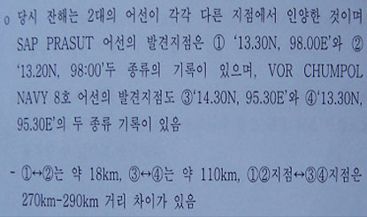 ▷ 이해할 수 없는 점은 위 두 지점간의 거리가 약 270~290km나 떨어져 있다는 것으로, 아무리 저인망 어선이라 정확한 수거지점에 대한 착오가 있다손 치더라도 거리 차가 너무 큼. (국정원종합보고서530쪽)