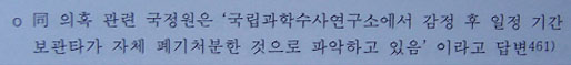 6-3. 더욱 놀라운 사실은 이 중요한 동체잔해가 폐기되어 현재 존재하지 않는다는 것인데, 국과수 감정 이후 국과수의 거듭된 회수 요구에도 불구하고 안기부가 그대로 방치하자 국과수가 임의 폐기해 버렸다는 것임. (KBS스페셜, 국정원종합보고서460쪽)