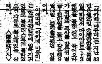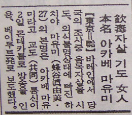 ▷ 다음날 일본의 교도통신은 ‘몬테카를로’ 방송을 인용하여 “음독한 하치야 마유미의 본명은 ‘야카베 마유미’이다”라고 베이루트 발로 보도함. (동아일보1987.12.2자, 조선일보1987.12.3자 11면)
