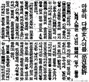 3-2. 그런데 1987.12.4자 언론보도엔 “바레인 현지로부터 일본경찰로 들어온 정보에 따르면, 음독여성의 소지품에서 1983년 밀수혐의로 한국입국이 금지된 일본 후쿠오카 거주 일본여성 ’야카베 마유미‘(30세) 명의의 운전면허증이 확인되었다”는 것임. (동아일보1987.12.4자 2면, 조선일보1987.12.4자, 국정원종합보고서322쪽)