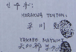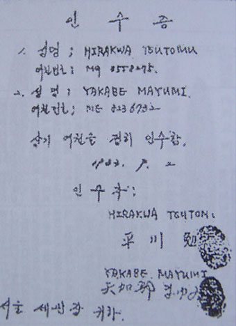 ▷ 또 한 명의 이름인 ‘히라카와 쯔토무’는 남자 이름인데, 히라카와(平川)를 'HIRAKAWA'가 아니라 'A'가 탈락된 'HIRAKWA‘로 표기한 점이 눈에 띔. (인수증 서명부분)