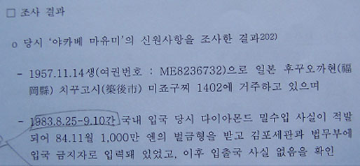 ▷ 이 사실을 뒷받침하는 것으로 2003년 KBS스페셜 취재결과 후쿠오카 거주 ‘야카베 마유미’는 1983년 한국에서 보석밀수 혐의로 지목된 인물과는 다른 사람이었다는 점임. 즉 그녀는 단지 자신의 신분 데이터를 도용당한 것이었음.