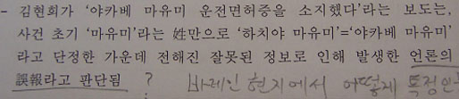 ▷ 운전면허증 소지 보도에 기초하여 음독여인이 ‘야카베 마유미’란 추측보도가 이어졌다면 ‘오보’라는 결론을 일면 수긍할 수 있겠지만, 반대의 순서로 보도가 이어진 것은 ‘오보’가 아니라 어떤 근거에 기초했다는 반증임.