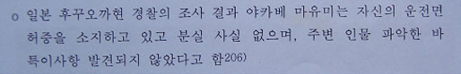▷ ‘야카베 마유미’는 안기부 수사발표와 함께 언론의 관심에서 완전히 사라지고, 또 바레인보고서(신동아 번역본)에도 ‘야카베 마유미’ 명의 운전면허증에 대한 기록이 보이지 않음.