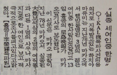 ▷ 사건 직후 홍콩언론(星島晩報)은 바레인의 하치야 마유미가 마카오에서 실종된 3명의 젊은 여성 중 한 명인 것 같다고 하면서, 실종여성 3명 중 2명이 마카오 소재 대풍(大豊)보석상의 여직원이었다고 보도했는데, 마카오는 김현희 소지 위조여권에 출입국 관련이 빈번하게 나타나는 곳이자 김현희의 진술내용에서 여타 장소에 비해 자신감이 느껴질 만큼 구체적이고 상세하게 언급되어지는 곳임. (조선일보1987.12.10자 11면)