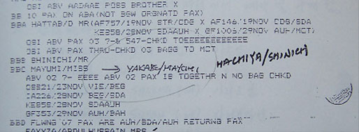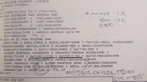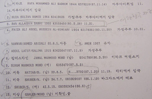 ‘FAYYZA ABDULHUSSAIN'(여자)은 ’FAIZA ALI ABDEL HUSSEIN AL-HIMIARY'로, ‘HAMEED HODA'(여자)는 ’HAMID HUDA'로, ‘RAFIE MA KADHIM'(남자)은 ’RAFA MOHAMMED ALI KADHUM'(이라크)로 대한항공과 외무부의 명단에 차이가 발생함.