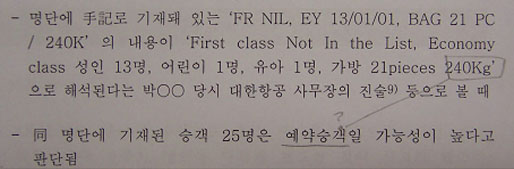 ▷ 국정원종합보고서는 명단 불일치에 대해 그저 예약 승객이 끼었을 가능성에 대해 언급하지만, 예약자 명단에 승객의 가방 수와 수하물 중량이 나타나는데 그 이유에 대해 아무런 해명이 없음.
