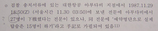 4-1. 안기부는 KAL858기 탑승객 중에서 바그다드→아부다비 구간만을 이용하고 아부다비에서 내린 하기자 15명이 모두 외국인임이 하기자 명단을 통해 확인되었다고 발표함.