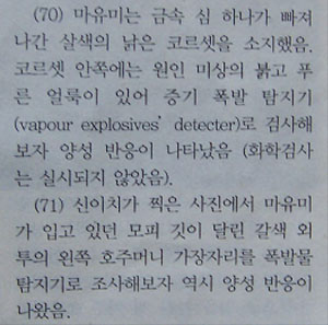 ▷ 바레인 보고서는 하치야 마유미의 코르셋과 코트에서 폭발물 양성반응이 나타났다고 밝히고 있음. (바레인보고서70,71항, 수사기록402쪽-김정기 서기관 자필진술서, 수사기록1047~1048쪽-수사기록공개 시 누락됨)