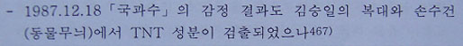 ▷ 1987.12.18 한국 국과수의 감정결과, 김승일의 복대와 동물무늬 손수건에서도 TNT 성분이 검출됨. (국과수가 2004.6.8 ‘KAL858 가족회’에 공개한 자료, 국정원종합보고서465쪽)