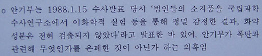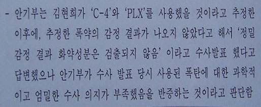 ▷ 안기부의 이러한 은폐는 국과수가 확인한 화학(화약)성분이 안기부가 발표한 폭발물(콘포지션4와 PLX)과 상이한 성분 때문임이 분명한 동시에, 이러한 다른 종류의 화학성분이 왜 나타난 것인지 현재까지 의문으로 남음.