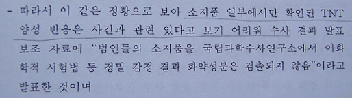 ▷ 국정원은 이에 대한 국정원과거사위의 문제제기에 대해 “소지품 일부에서만 확인된 TNT 양성반응은 사건과 관련 있다고 보기 어려워 그랬다”며, “당시 발표내용은 콘포지션4와 PLX 성분이 검출되지 않았다는 의미”라고 둘러댐. (국정원종합보고서466쪽)