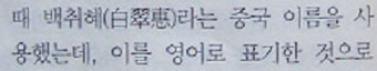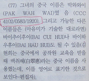 ▷김현희의 안기부신문조서에 나타나는 중국인 위장 이름 백취혜의 漢字표기는 모두 百萃惠(백췌혜)인데, 바레인보고서엔 白翠惠(백취혜)라 되어 있어 한자의 성씨姓氏 白과 百의 차이뿐만 아니라, 이름의 ‘취’와 ‘췌’는 북경어 발음으로 모두 ‘CHUI'로 발음되나 엄밀히 다른 한자임. (수사기록338, 454쪽, 바레인보고서77항)