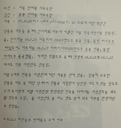 ▷ 원문이 공개된 비엔나 인터폴의 그것과 비교해 볼 때 홍콩 인터폴의 회신문은 양과 질에서 이해가 되지 않음. 아마도 원문엔 출입국 관련내용이 아예 없거나, 다를 가능성이 상존한다고 보아짐.