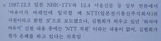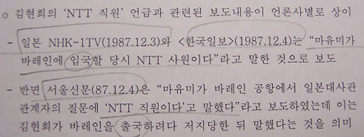 ▷ 당시 언론보도에선 김현희가 자신을 NTT 직원이라 밝힌 시점이 바레인 입국과정에서인지, 출국과정에서인지, 아니면 모두에 해당되는지 엇갈림. (국정원종합보고서293쪽)