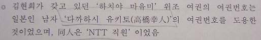 ▷ 위 보도들은, 김현희 소지 위조여권에 데이터를 도용당한 인물인 ‘다카하시 유키토’(高橋幸人)가 실제 NTT(일본전신전화공사) 직원이었는데, 이 사실을 김현희가 알고 있었다는 사실을 의미함. (국정원종합보고서294쪽)