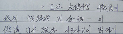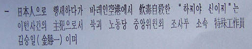 ▷ 김승일은 위조여권 상의 자신의 이름인 ‘하치야 신이치(蜂谷眞一)’의 ‘眞’을 무심결에 일본어로 같은 발음의 글자인 ‘信’으로 쓰려다 고쳐 ‘眞’이라 씀.
