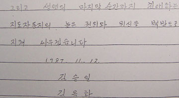 13-1. 1987.11.30 22:00경 김승일이 리젠시-인터콘티넨탈 객실을 방문한 김정기 서기관과의 필담과정에서 자신의 이름을 고쳐 씀. (수사기록452쪽, 국정원종합보고서606쪽)