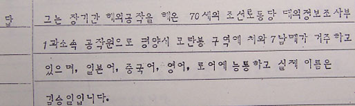 ▷ 안기부 수사기록의 金勝一이란 한자명은 이에 대한 김현희의 어떤 진술도 없이 나타난 것인데, 여타의 수사기록에서도 안기부가 어떻게 김승일의 한자명을 알게 된 것인지 확인할 수 없음.