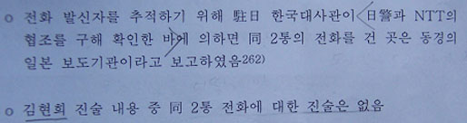 ▷ 국정원종합보고서는 단지 일본의 보도기관으로부터의 전화통화라고 보고한 국정원의 자료를 확인했지만, 어느 보도기관으로부터 걸려온 것인지, 또 당시 안기부가 수사발표 시 왜 그 사실을 감췄는지 등의 구체적인 내용은 없음. (국정원자료No.126, 국정원종합보고서349쪽)