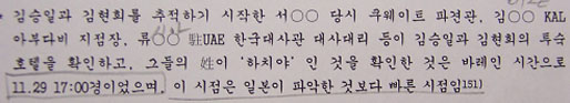 ▷ 당시 안기부는 두 하치야의 리젠시-인터콘티넨탈 호텔 투숙 사실을 인지한 때는 다음날인 1987.11.30 17:00경이라고 발표했는데, 국정원종합보고서는 어찌된 일인지 당일인 1987.11.29 17:00경이라고 기재하여 만 하루의 시간 차이가 나타남. (국정원종합보고서301쪽)