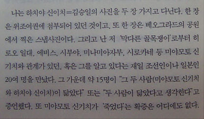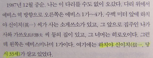 13-2. ‘파괴공작’은 도쿄의 동음이자의 두 하치야가 살고 있는 도쿄도(都) 시부야구 에비스와 히로오 일대의 코리언 커넥션에 연결되는 인물로서 재일한국인 ‘미야모토 신기치(宮本新吉 한국명 이수업李壽業)’라는 인물이 김승일이라고 지적함. (‘파괴공작’ 89~90쪽)