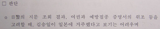 ▷ 국정원종합보고서의 위 결론은 도저히 납득할 수 없는 것임. 여권과 예방접종서의 위조가 일본 거주 여부와 도대체 무슨 상관관계가 있다는 것인지 이해할 수가 없는데, 이는 정해진 결론으로 이끌기 위한 억지 논리라는 인상을 줌.