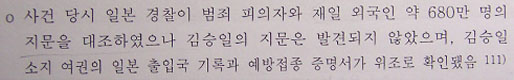 13-3. 국정원종합보고서는 미야모토 신기치가 김승일이 될 수 없는 판단의 근거로, “일본 경찰의 (김승일) 지문조회결과 (일본에 同지문이 없음)와, 김승일의 여권과 예방접종서의 위조 등을 고려할 때 김승일이 일본에 거주했다고 보기 어렵다는 점”을 내세움. (국정원종합보고서286쪽)