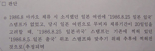 ▷ 국정원종합보고서는 제기된 의혹에 대한 판단에 있어 ‘추정’이란 단어를 너절히 앞세웠는데, 김현희의 마카오 체류 시 시기적으로 소급되어 찍혀 있던 1986.8.25자 일본 귀국도장의 의혹에 대해, ‘소급’이란 사안의 본질을 외면한 채, 그저 “일본 출국도장에 맞추기 위해 추후에 찍혀진 것으로 추정된다”고 한 것이 하나의 예임. (국정원종합보고서374쪽)