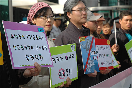 이 단체는 이날 오전 9시 30분 서울 도렴동 외교통상부 청사 앞에서 기자회견을 갖고 "유엔안보리 결의 1718호 어디에도 북이 인공위성을 발사하면 안 된다는 조항은 없다"며 "한.미.일 당국이 유엔결의 1718호를 근거로 제재를 가하려 한다면 이는 억지"라고 비판했다.