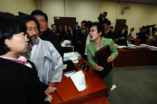 오전 11시 45분께 국회 외교통상통일위원회에서 박진 위원장이  '한.미FTA 비준동의안'처리를 시도하자 이를 저지하려는 여야 의원들이 뒤엉켜 몸싸움을 하고 있다. 이날 박진 위원장은 의사봉 대신 주먹으로 책상을 세번 내리치고 한.미FTA 처리를 선언했다. [사진-인터넷신문공동취재단]