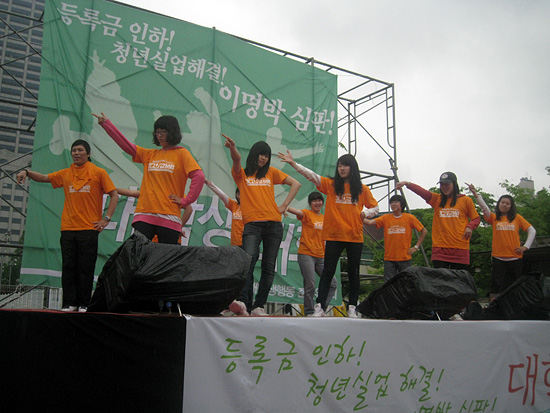 신대방역에서 지하철을 통해 이동한 대학생들은 빗 속을 뚫고 "등록금을 인하하라", "청년실업 해결하라", "이명박을 심판하자"고 외치며 잠실역 사거리(롯데백화점 앞)까지 지나가는 차량을 막고 가두 행진을 펼쳤다.