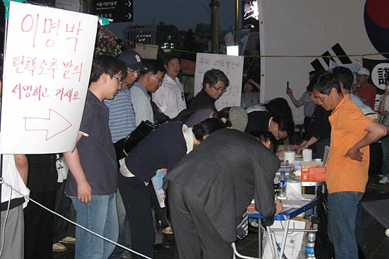 특히 추모식장 옆에는 크고 작은 촛불집회가 이어졌다. 차분하게 자유발언을 이어나가는 모습이지만 '독재타도'를 외치는 시민들도 있다. 분향소 옆에서 진행되는 '이명박 대통령 탄핵 발의 서명장' 앞에서도 사람들이 몰린다.