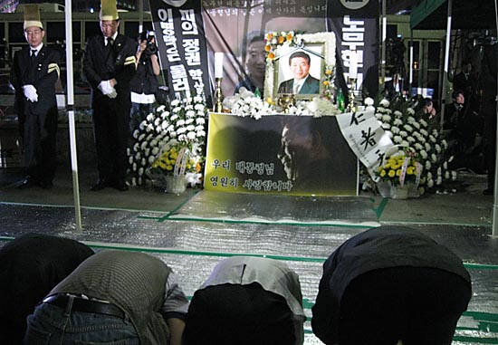 노 대통령 서거 3일째인 25일 저녁, 경찰버스로 둘러싸인 대한문 앞 추모행렬로 가득 찼다. 대한문 양쪽으로 수백 미터씩 늘어난 줄의 끝을 찾기 힘들다. 1분마다 40-50명이 헌화를 하고 가지만 줄은 줄어들지 않고 늘어나기만 한다.