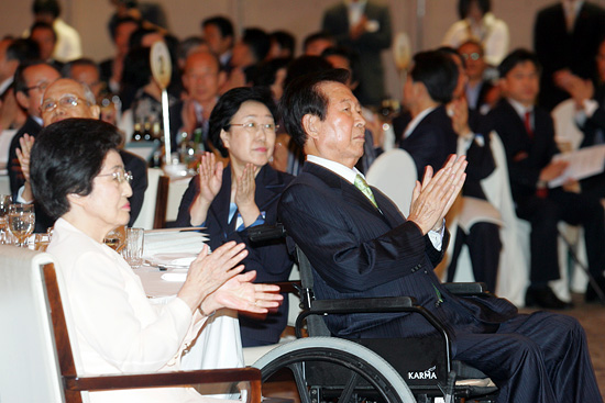 ▲ 행사장에 참석한 김대중 전 대통령과 이희호 여사. 건강이 좋지 않은 김 전 대통령은 행사 시작 40분 후에야 입장했고 휠체어에 몸을 의지해야 했다. [사진-통일뉴스 조성봉 기자]