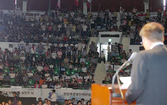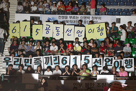 14일 오후 2시 서울 장충체육관에서 학생.시민사회단체를 비롯해 야4당 관계자 등 2,500여명이 모인 가운데 '다시, 6.15'라는 주제로 '6.15공동선언 9주년 범국민실천대회'가 열렸다.